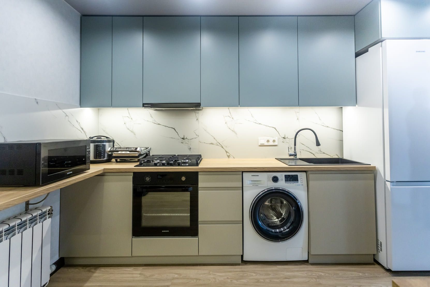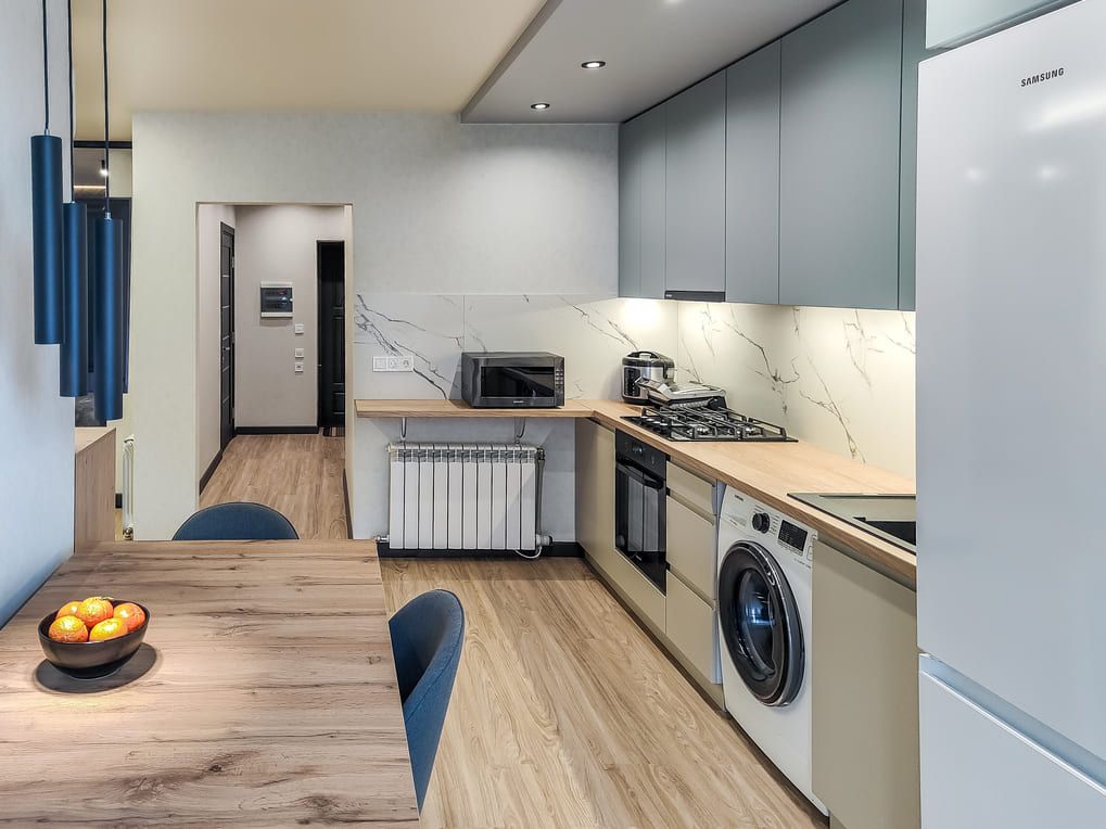 Г-подібна кухня з ДСП-стільницею, мікрохвильовою, плитою з духовкою, витяжкою, пральною машиною, великим холодильником та продуманими системами зберігання.