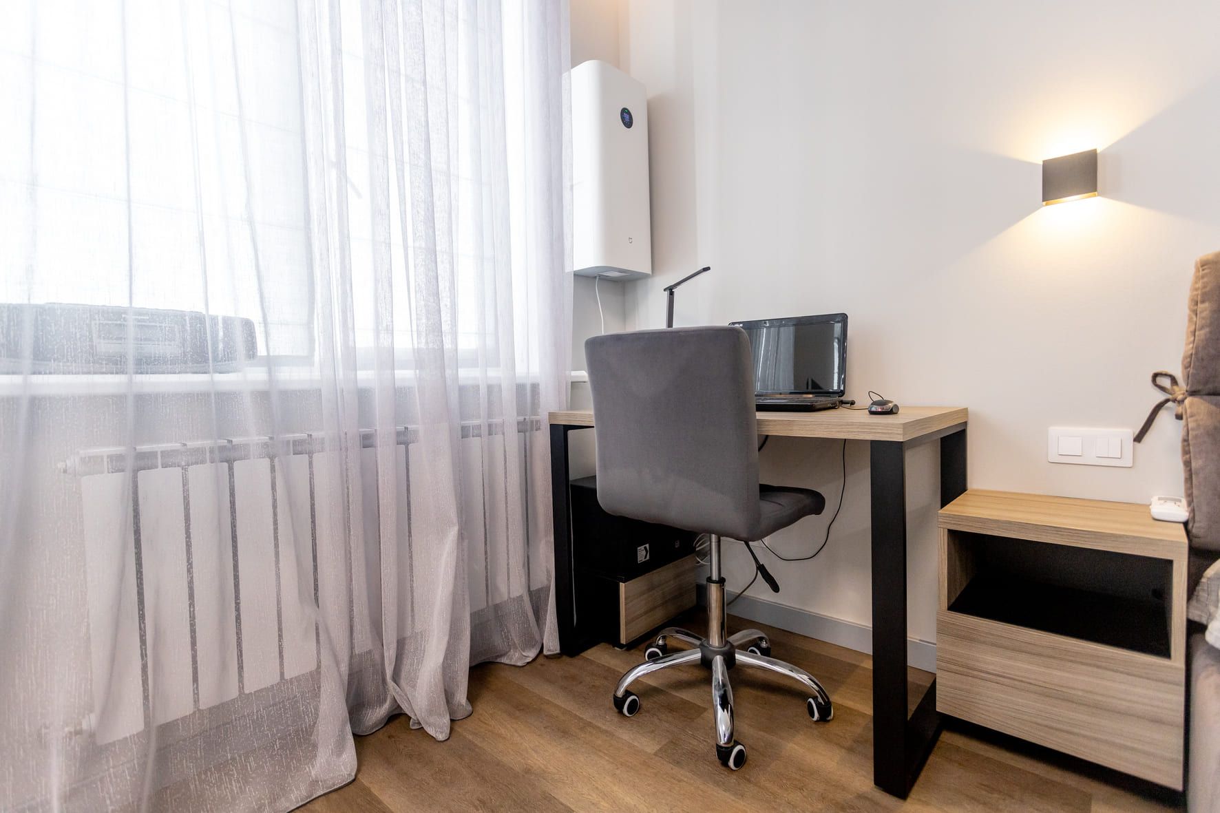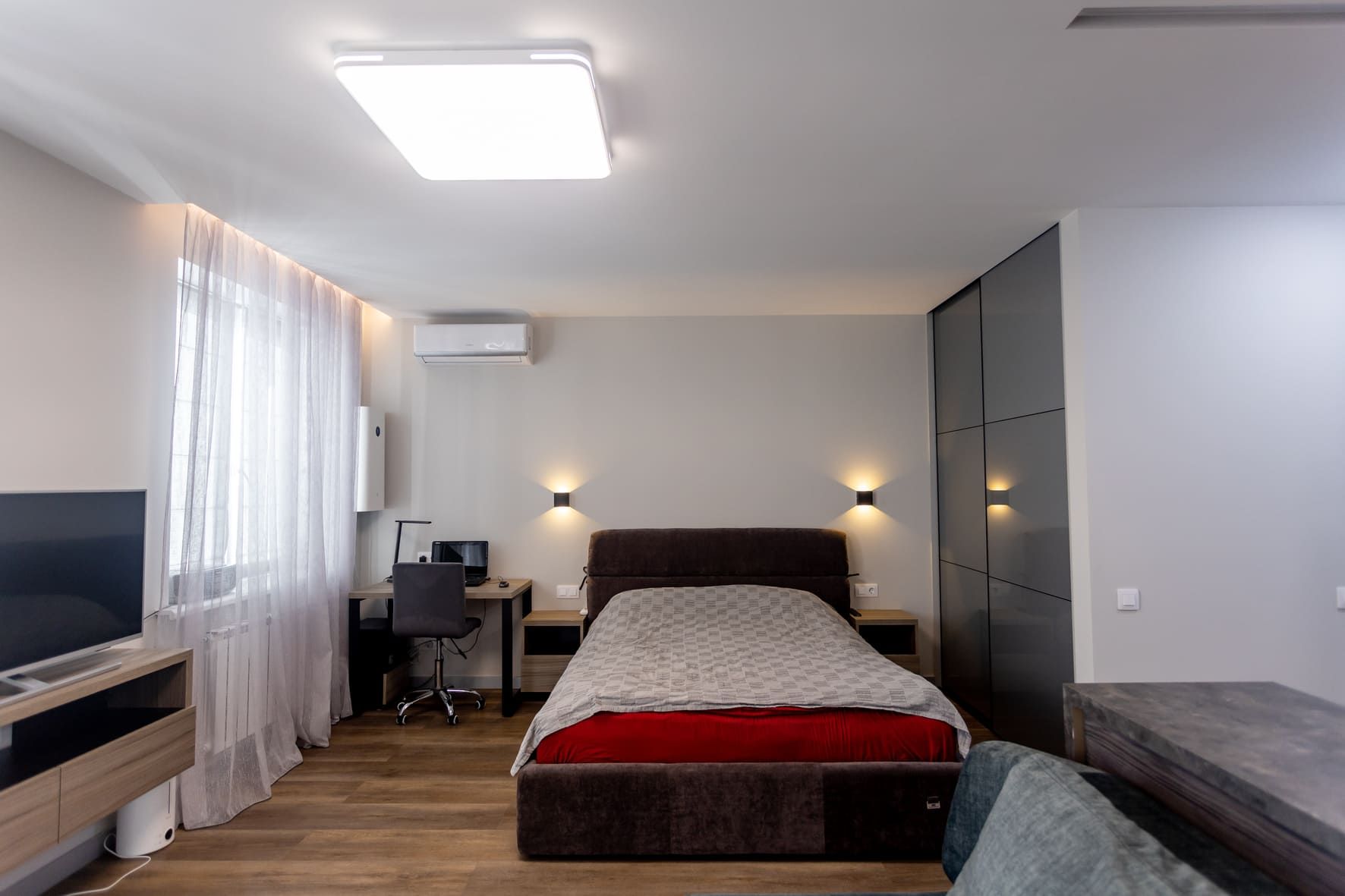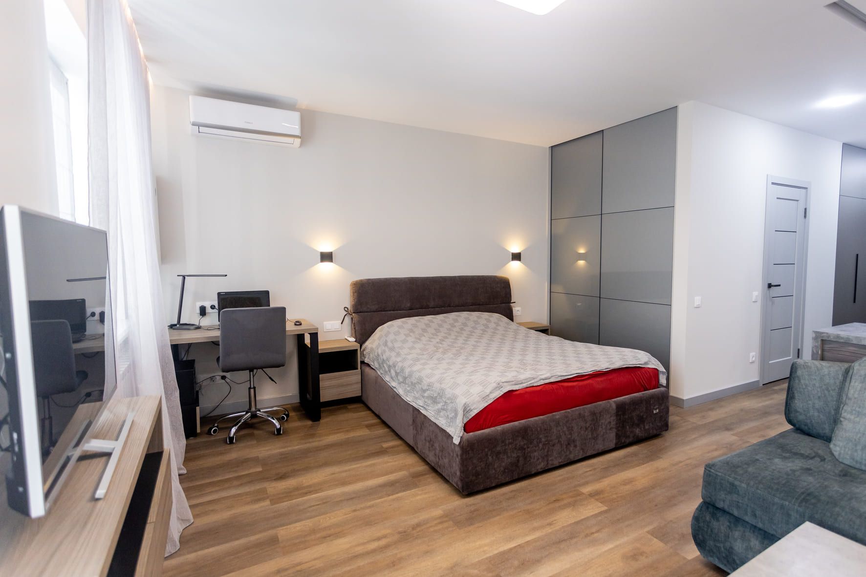 - Реалізовано: студійне планування з окремим санвузлом, балконом, зоною спальні та робочим місцем.