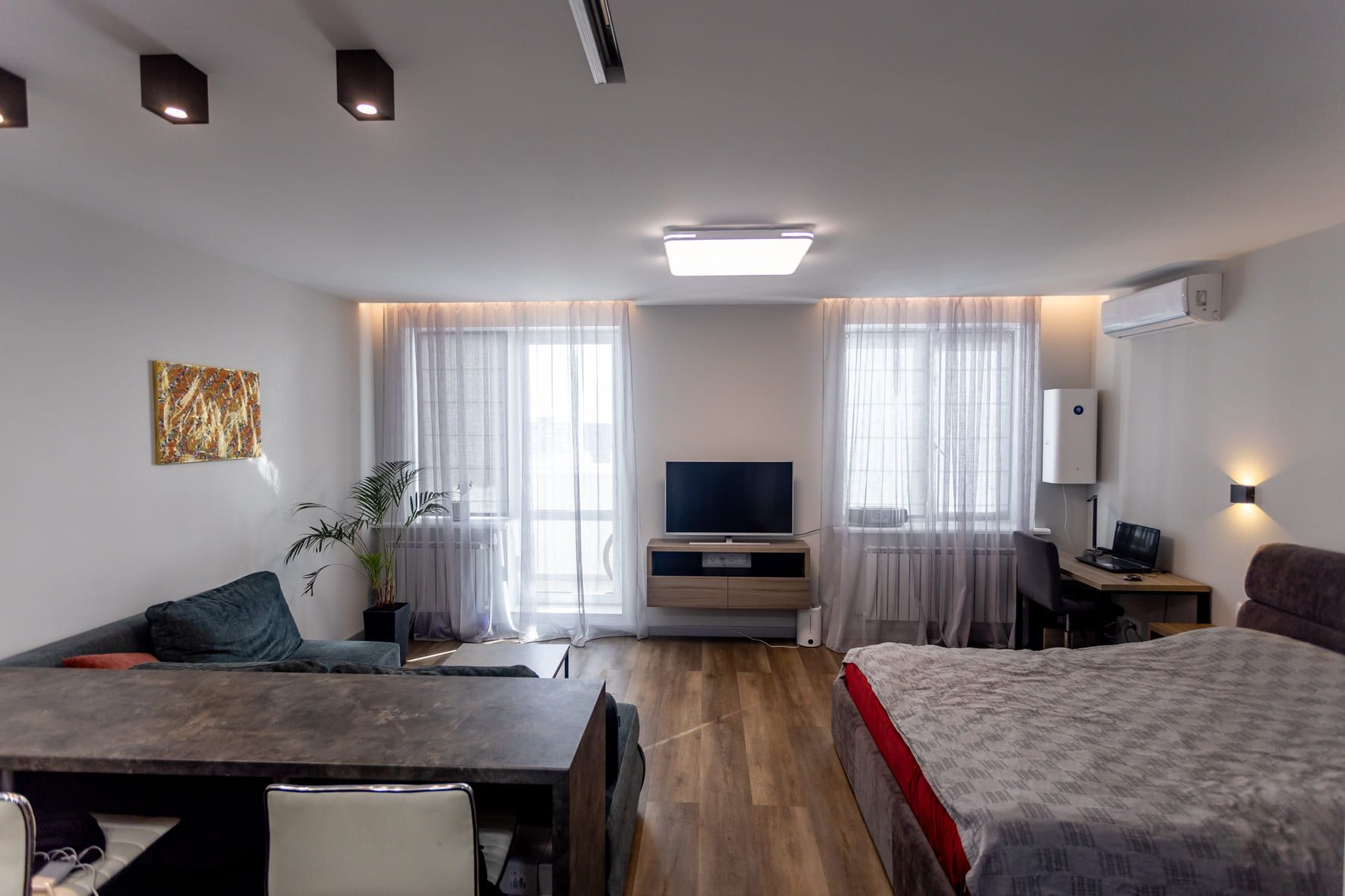 - простору студію із зоною відпочинку, спальнею, робочим місцем і виходом на холодний балкон.