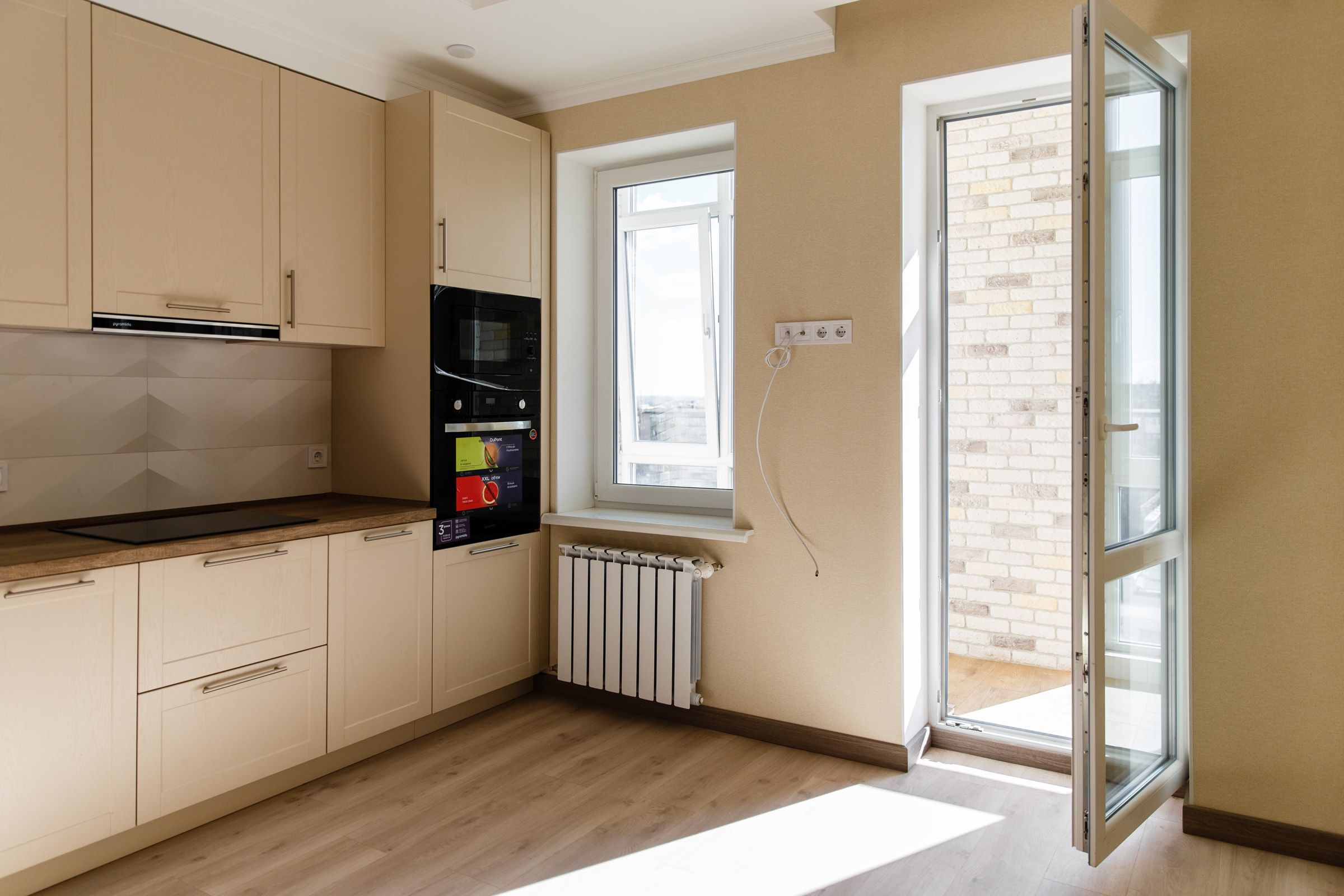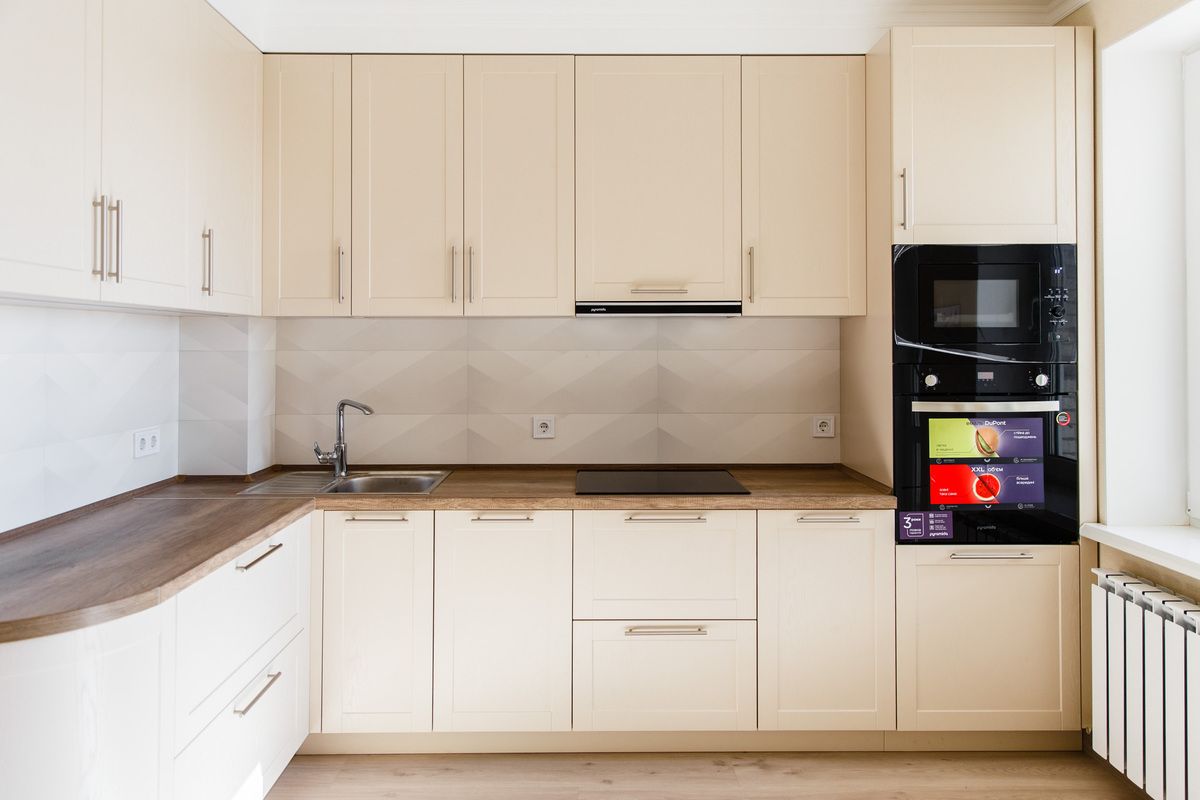 Кухня виконана за сучасними стандартами: висувна витяжка, індукційна плита, LED-підсвічування, вся техніка прихована в корпусах меблів, включаючи холодильник.