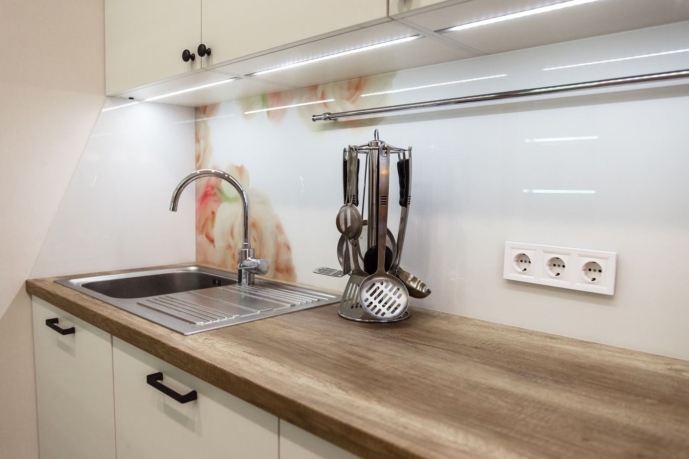 Стелі: біла матова натяжна стеля у вітальні та кухні; гіпсокартон з шпалерами у спальні та дитячій для більшої екологічності.
