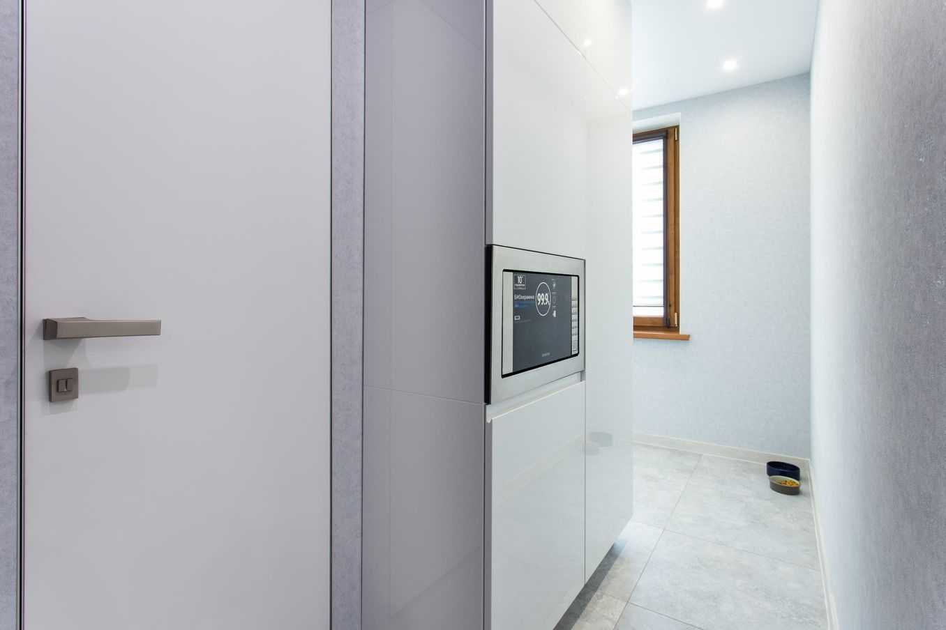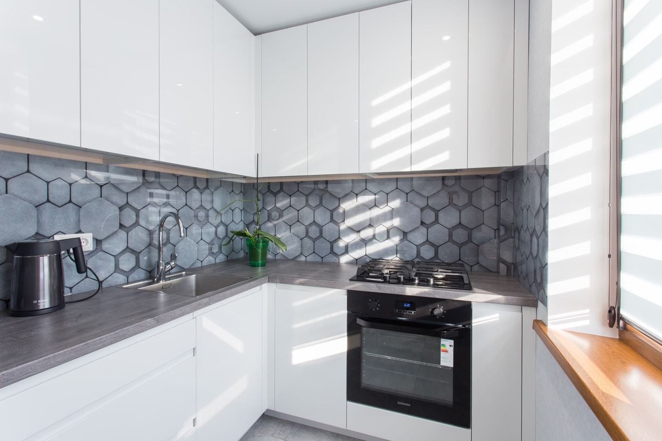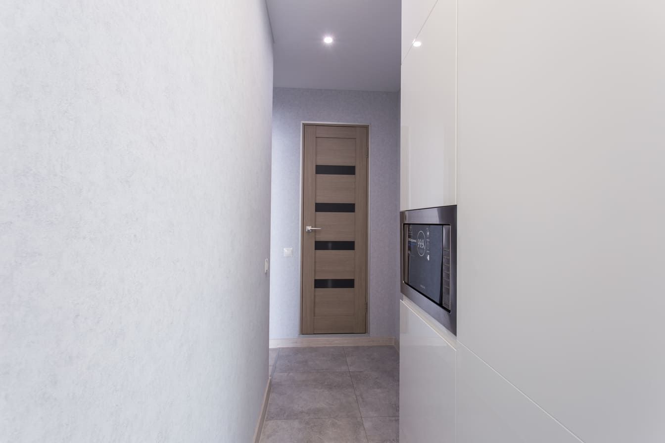 Чистове оздоблення надало квартирі остаточного вигляду. На стелях встановлені натяжні системи — білі матові по всій квартирі і глянцеві в спальні. На підлоги в кімнатах і коридорі поклали ламінат з пластиковим плінтусом, а на кухні і балконі — плитку і керамограніт. Коридор і частина стін обклеєні шпалерами, укоси вхідних дверей прикрашені МДФ-накладкою. Особлива увага приділена кухні: фасади виконані з білого фарбованого МДФ, фартух — з загартованого скла, техніка повністю вбудована, а мийка Franke ідеально вписана в загальну концепцію.