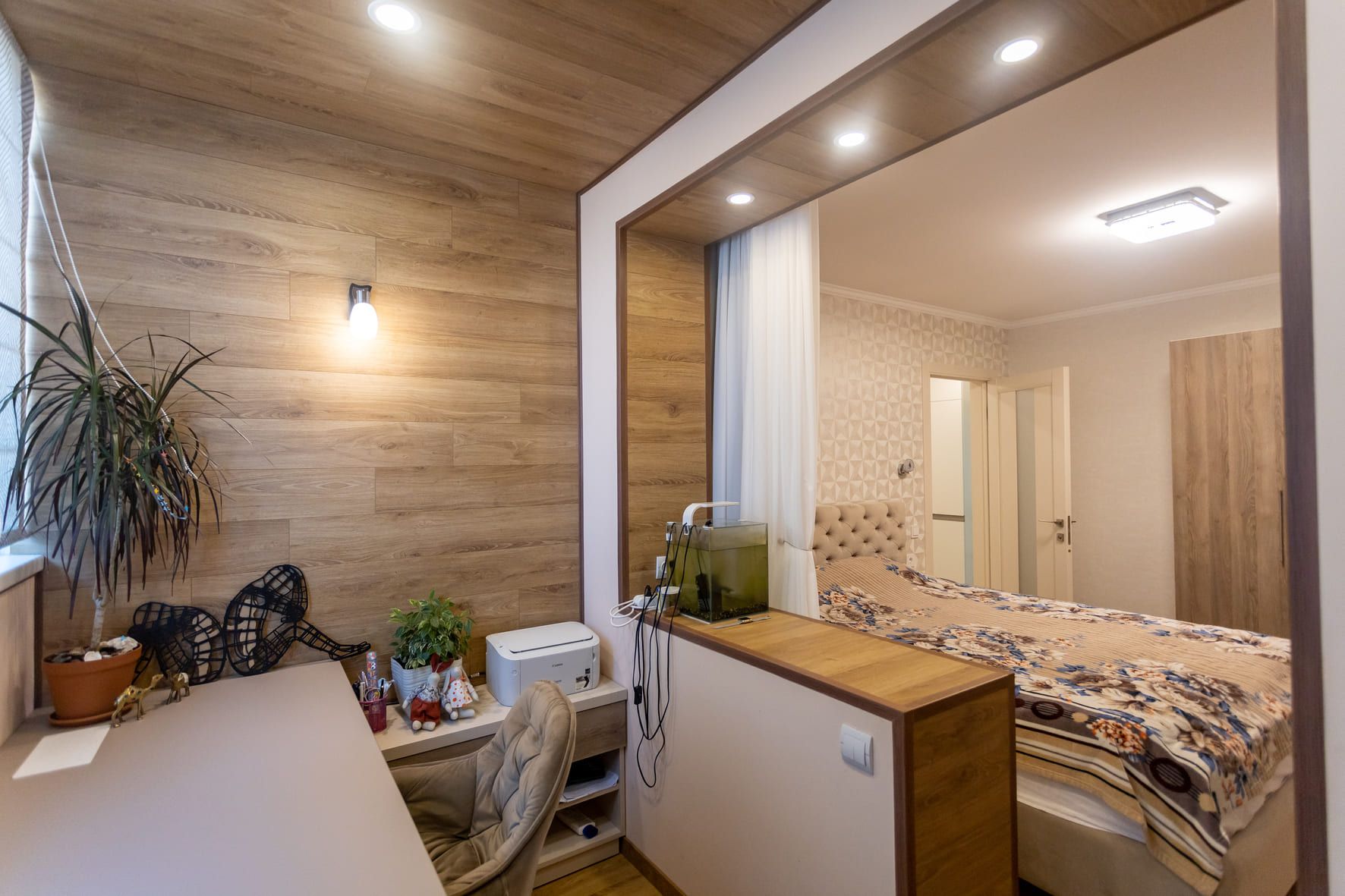 Зі спальні є вхід в окремий кабінет господині, повністю оброблений ламінатом — стіни, підлога і стеля. Незважаючи на сміливе рішення, матеріал відмінно витримав експлуатацію.