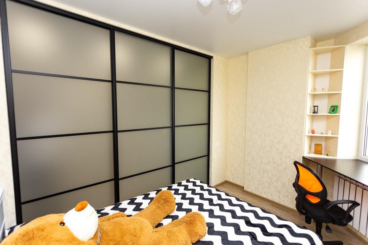 - уютную спальню с большой кроватью, встроенным шкафом-купе и рабочей зоной у окна.