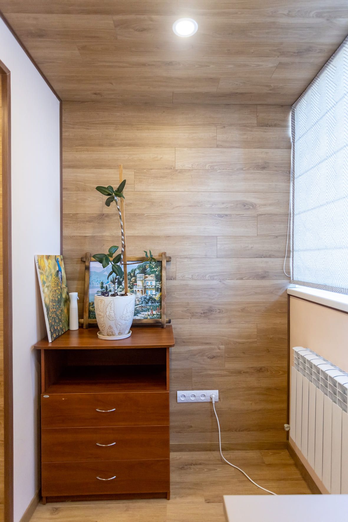 Из спальни есть вход в отдельный кабинет хозяйки, полностью отделанный ламинатом — стены, пол и потолок. Несмотря на смелое решение, материал отлично выдержал эксплуатацию.