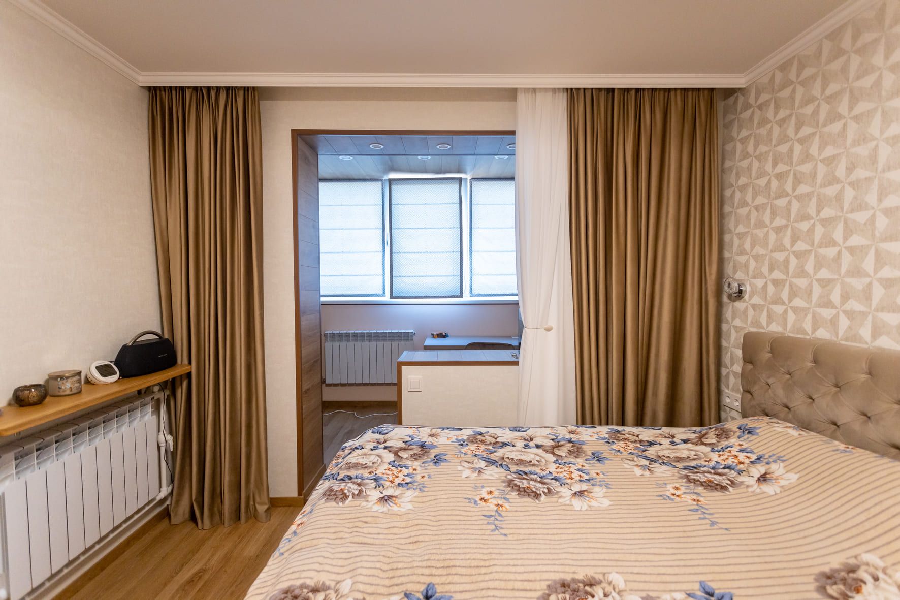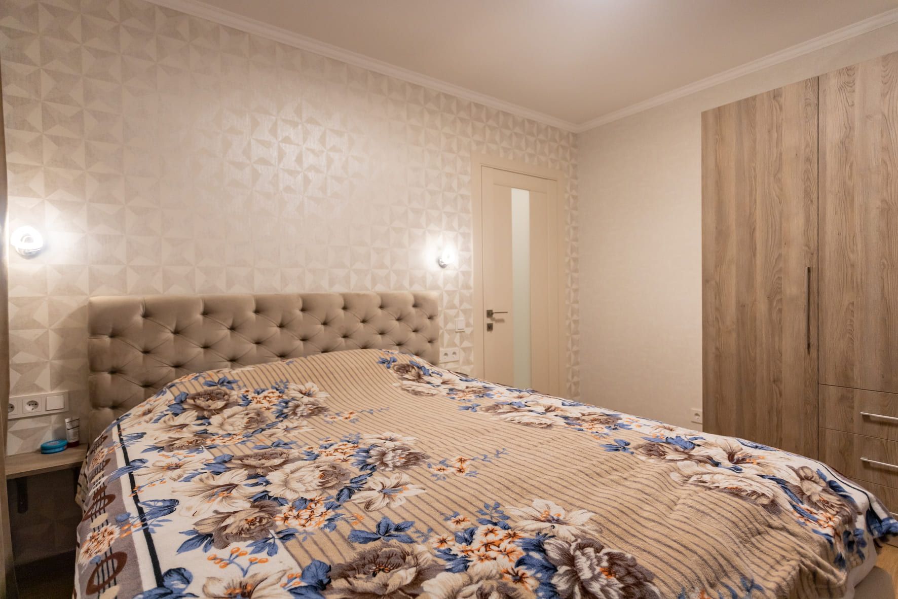 Минималистичное и спокойное пространство: кровать, тумбы, подсветка, шкаф и текстиль. Обстановка сохранилась практически в первозданном виде.